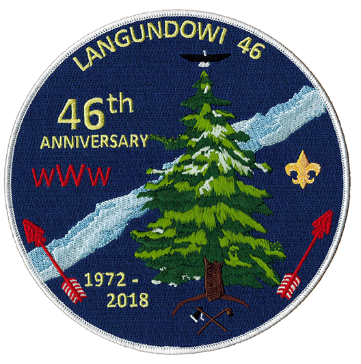 The FIRST issue was a fully embroidered flap that had a dark blue solid background and a white rolled-edge border. The Great Tree of Peace totem was centered, with a light blue creek running diagonally behind it. The words "LANGUNDOWI LODGE" were stitched in yellow across the top, with a large "46" in yellow on the right side. "wWw" (monogram style) was stitched in large red letters on the left side and two red arrows along the bottom pointing away from the base of the totem. Was restricted to three-per-life: two at Ordeal, and one at Brotherhood. | |
