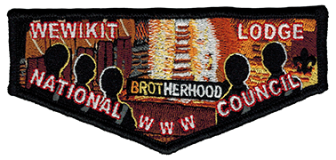 National OA Committee, NCf2 ![]() red rolled edge on black twill, white reverse aka "the black flap" Discontinued in 1995 or 1996 image courtesy of Robert C. Evans |