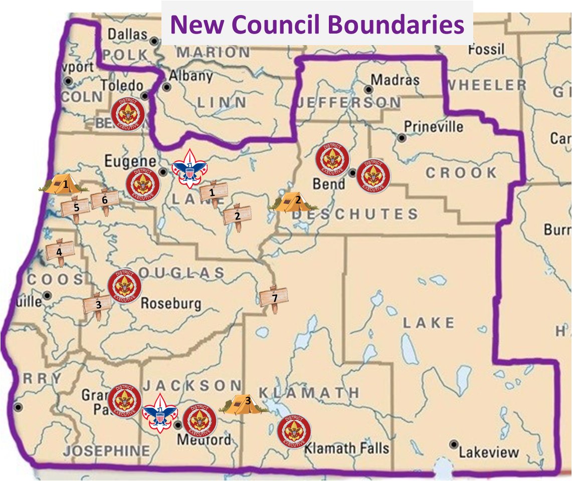 A map of the new council boundaries was posted on Oregon Trail Council's Facebook page. However, this only show counties in Oregon, and Crater Lake Council also included counties in California. While district maps shown on Nevada Area Council's website appear to show Modoc County as being part of its Zephyr District, a Sep 19th post by Daniel Washburn, Pacific Rivers District Commissioner on Crater Lake Council Facebook page confirms otherwise: