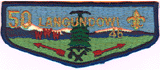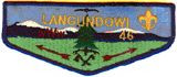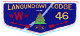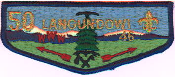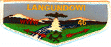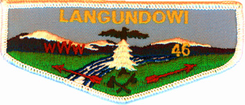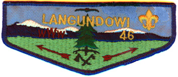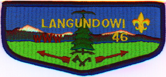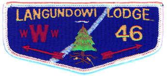 The THIRD issue was not fully embroidered, and had a purple rolled-edge border and a light blue twill background with purple mountains capped in white. The totem was more closely patterned after the original Iroquois Tree of Peace design, with a larger green pine tree, smaller stylized eagle, and no creek. "LANGUNDOWI" was stitched in yellow across the top of the totem, with "46" in yellow on the right side. Two red arrows along the bottom and "wWw" in small red letters on the left side. Yellow fleur-de-lis stitched in upper right corner. |