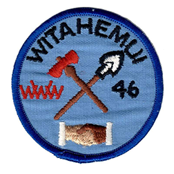 The FIRST issue was a fully embroidered flap that had a dark blue solid background and a white rolled-edge border. The Great Tree of Peace totem was centered, with a light blue creek running diagonally behind it. The words "LANGUNDOWI LODGE" were stitched in yellow across the top, with a large "46" in yellow on the right side. "wWw" (monogram style) was stitched in large red letters on the left side and two red arrows along the bottom pointing away from the base of the totem. Was restricted to three-per-life: two at Ordeal, and one at Brotherhood. | |